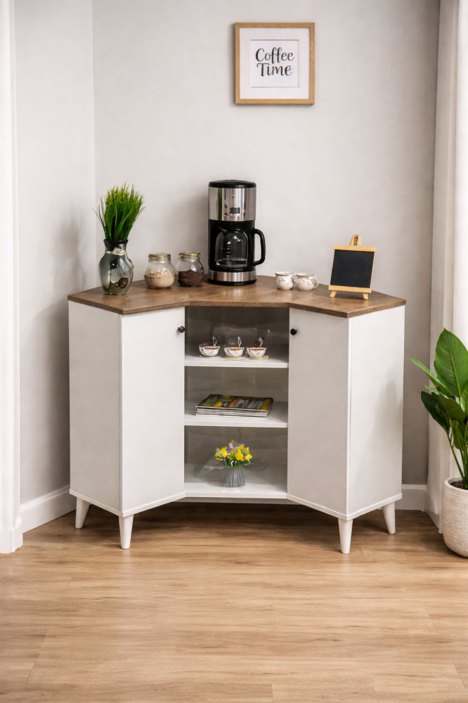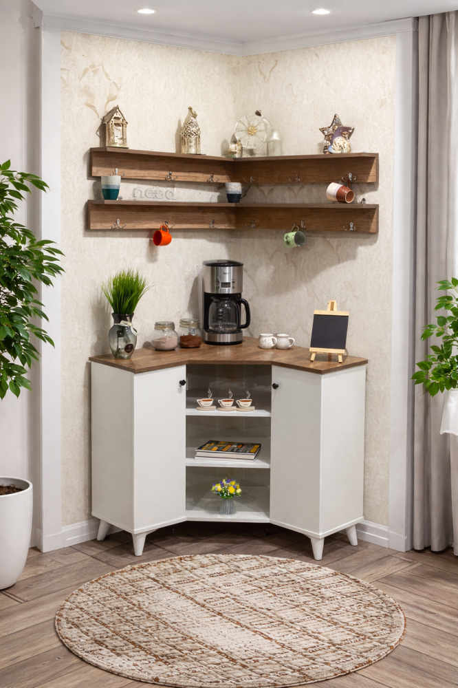 ركن قهوة منزلي بوفيه خشبي وأبيض دولاب لتنظيم ركن قهوتك مخصص للزوايا في منزلك بتصميم أنيق وجميل يضيف لمسة أنيقة لبيتك مميزاته: - صناعة وطنية - خشب تايلندي - لون أبيض عصري -سطح أنيق - درجين طولية مغلقة للتخزين المخفي - يخدمك في الزوايا الفارغة في منزلك