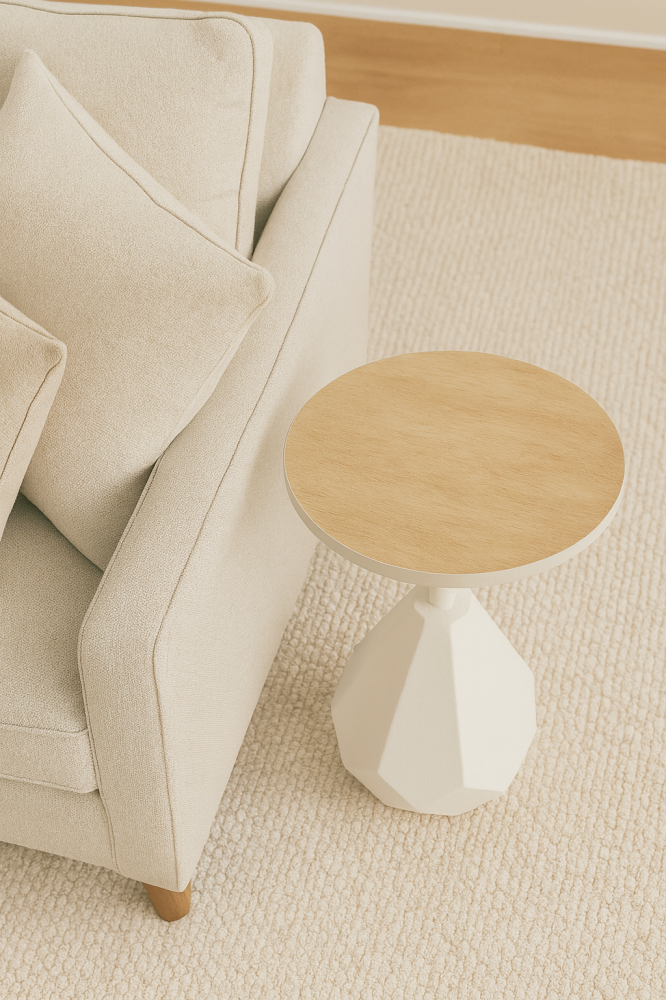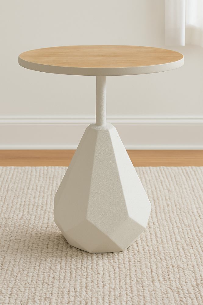 طاولة جانبية فاخرة بتصميم عصري أنيق، تجمع بين سطح خشبي دائري بملمس طبيعي وقاعدة معدنية هندسية تمنحها ثباتًا وأناقة استثنائية. بفضل تصميمها الجذّاب، تعتبر هذه الطاولة إضافة مثالية لغرف المعيشة أو المكاتب أو غرف النوم، حيث تضيف لمسة ديكور راقية وتتناسب بسهولة مع مختلف الأنماط الداخلية.