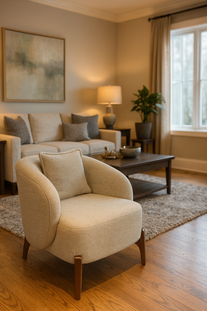 - أفكار ديكور: ضعي الكرسي في زاوية مشمسة مع طاولة جانبية خشبية تكمل الإطلالة الأنيقة أو أضيفي وسائد مزخرفة بألوان محايدة أو ذهبية لإضفاء مزيد من الرفاهية والراحة.