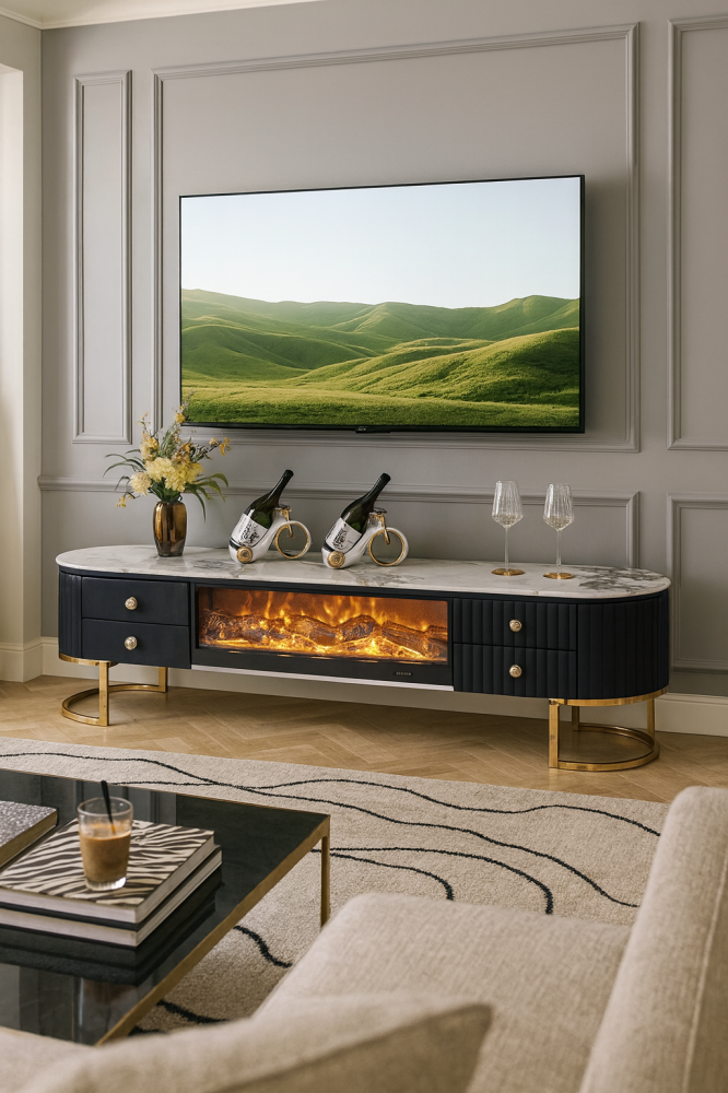 قوة الفولاذ وأناقة الزجاج… وحدة تلفزيون تضيف لمسة فخامة لمنزلك !
